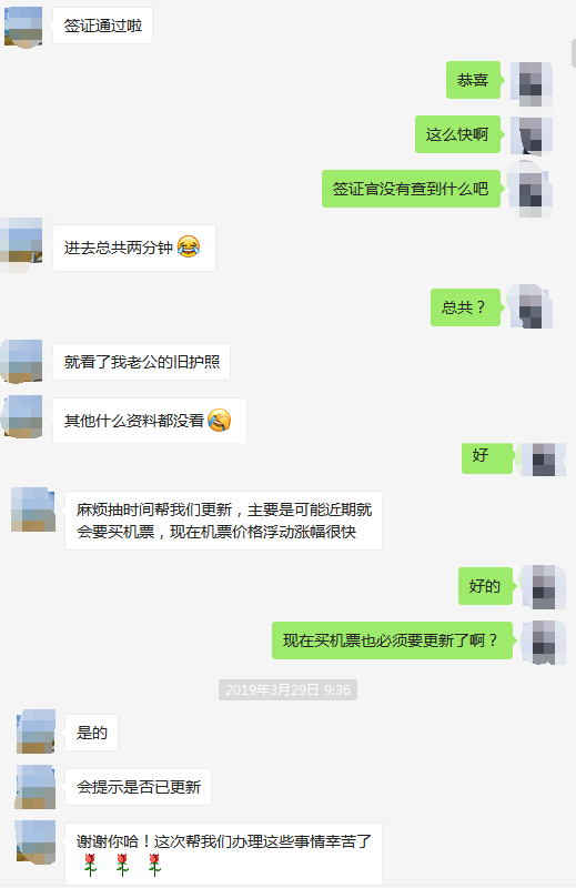 在面簽前,鷹飛國際給趙先生和趙太太做了培訓指導,所以很大一部分降低了他們的緊張感。面簽時,趙先生和趙太太回答的也比較流利,進去不到2分鐘,就通過了面簽。